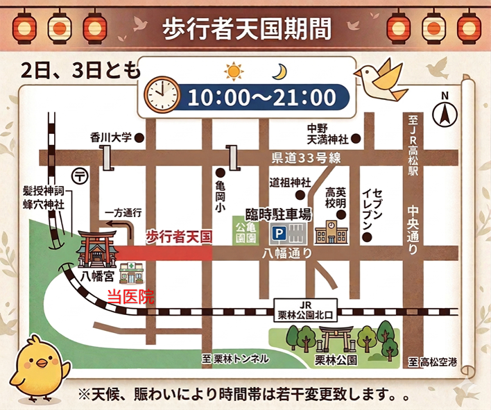 これに伴い、医院前の道路(八幡通り)を含む周辺一帯で、歩行者天国等の交通規制が実施されます。